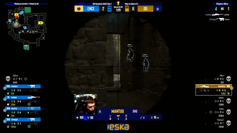 手枪局拿下的OG连夺三分。长枪局ENCE压中路,OG提长廊再拿一分。次局OG再次干净利落提B,on fire。第六局ENCE默认架死干摸的OG终于拿到第一分。ENCE似乎找到OG进攻漏洞,不再受道具干扰架死第一枪位再拿一分。valde后路1v2扳回劣势,比分6-2。OG多次因为单人干摸被ENCE追分,ENCE慢慢找到状态,上半场拿到8分。