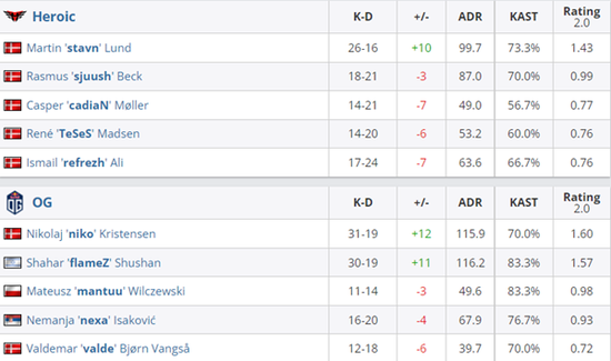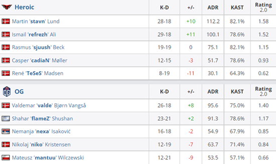 次局niko再次扮演关键人物,接住回防两人追回一分。第十三局nexa指挥到位第一时间call长廊连拿四分。OG枪越打越硬,截至上半场最后一局打出 ON FIRE,比分9-6。下半场手枪局nexa赌神上线call 4A轻松拿下手枪局。长枪局Heroic抱团夹A枪械优势取胜。次局半起的OG有flameZ的黑屋战神三杀加持翻盘成功。第二十一局Heroic默认被长廊反清闪杀光,OG将比分反超。第二十三局Heroic被B区道具拖足时间,雷包还被混死时间耗尽OG再拿一分。Heroic抱团干拉A区秒杀mantuu,耗足时间导致c4爆炸,比分13-11。关键局OG前压中路付出惨重代价,stavn黑屋突破双杀追平比分。经济不好的OG被Heroic拿到14分。次局OG极高协同率配合闪光回防再次扳平比分。第二十九局Heroic突烟闪光被flameZ拦下,OG拿下赛点。经济不好的Heroic失去图一。