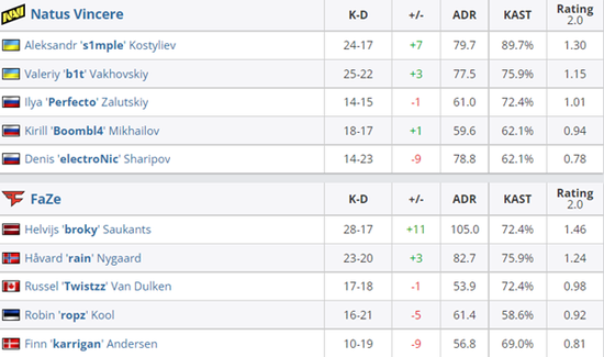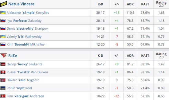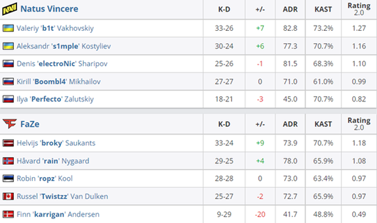 NaVi提拱门,rain连杀两人,B小大狙又架死过点,FaZe拿到十四分。次局NaVi夹B战术被broky大狙瓦解,NaVi拿到赛点。第二十六局NaVi一换一抢下A点追回一个赛点。次局NaVi控下中路,击杀黑屋ropz轻取A点,三人保枪。NaVi稳扎稳打默认架死两人再追一个赛点。第三十局broky狙掉拱门b1t,A1和A2瞬间联动攻破A区将比赛拖入加时。加时赛第一局胖球携手electroNic突破B小拿到第一分。次局rain携手ropz双人五杀还以颜色。