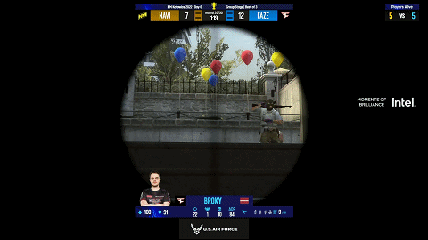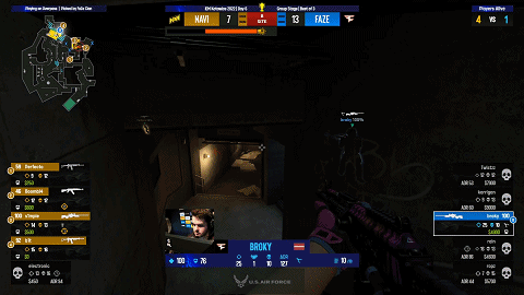 道具不充足的FaZe抱团一波提A,无伤下雷包,karrigan顶死A大两人,比分7-2。第十局rain一人骚扰A区,其余人速提B区,NaVi补防迅速追回一分。次局FaZe动粗rushB,Twistzz精准爆头双杀挽回劣势,比分8-3。NaVi控下工地占据主动权,单摸的karrigan也被断下,FaZe经济告急。