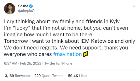 乌克兰的战局依旧在发酵中,NaVi选手s1mple在备战比赛的同时也心系家乡的局势。