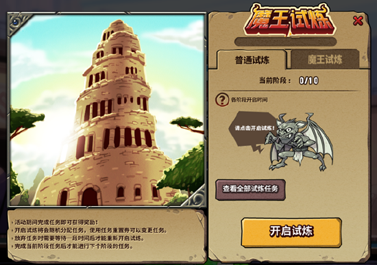 玩家点击“开启试炼”可接受到系统随机分派的任务。普通试炼共10轮任务