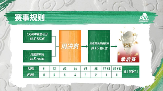 在赛制安排上,本届比赛全程采用“积分赛制”,24支PCL俱乐部将分为三大赛区进行常规赛的角逐。常规赛每周二至周四进行周中赛,积分排名前8的战队将直接晋级当周周决赛。剩余16支战队将参加周五的突围赛,通过积分排名决出最后8个周决赛的参赛资格。4周常规赛结束后,周决赛累计积分排名前16名的俱乐部将晋级季后赛之中。