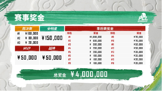 与2021PCL夏季赛相同,本次春季赛总奖金仍然为400万人民币。其中常规赛周决赛前三名奖金共80万人民币,全明星赛奖金15万人民币,个人奖项MVP和战神奖金分别5万人民币。季后赛排名奖金295万人民币,其中冠军奖金高达100万人民币。