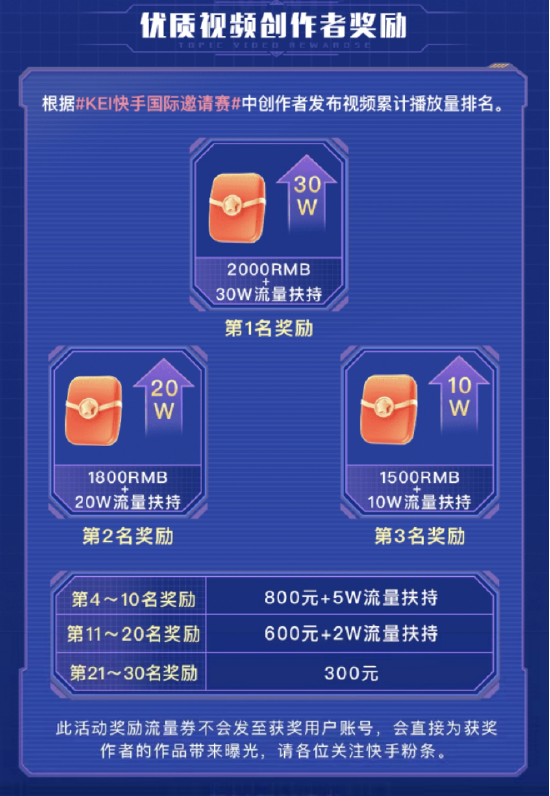 值得关注的是,赛事之余,快手还推出了视频征集活动,通过300至2000元不等的现金奖励及至高30万的流量扶持,激励快手站内游戏达人及电竞爱好者进行赛事内容二次创作。