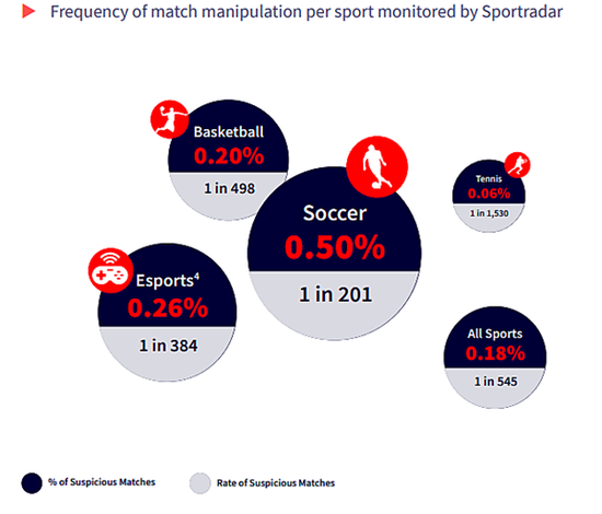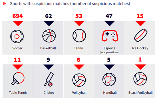 专门收集和分析体育赛事数据的瑞士公司Sportradar公布了一份有关假赛话题的报告,该报告显示2021年假赛检测系统共发现可疑案件903起,直接创下假赛数据新高。