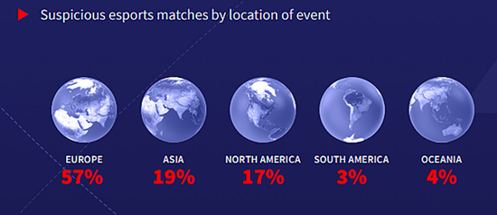 疑似假赛的电竞比赛数据的领头羊地区是欧洲,占总数据的57%,其次是亚洲(19%),而北美则以17%的数据排在第三,南美洲和大洋洲各有不到5%的数值。