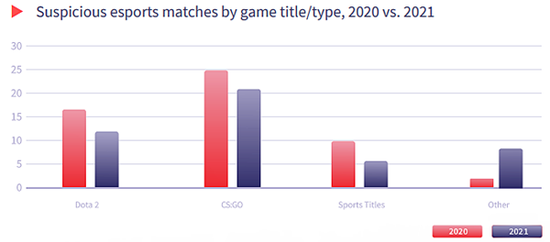 在相关电子竞技项目中CS:GO与Dota2是假赛数据最多的。Sportradar的专家阐述了这两个项目在菠菜公司中是有多么的抢手,有各种各样的比赛因素都可以成为他们的赌项。而在诸如FIFA和实况足球这种体育类的电竞项目中也检测到了疑似假赛的行为。
