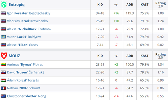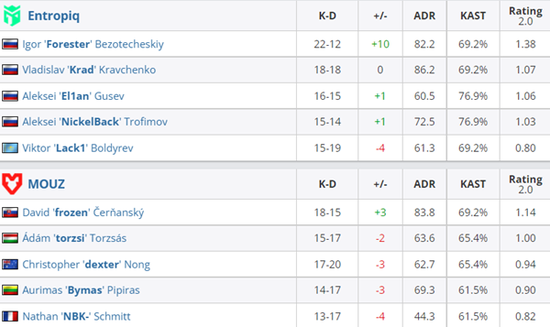 下半场手枪局Bymas警家精准三杀夺下手枪局。长枪局Entropiq给予B区压力,Forester摸到VIP完成三杀,比分10-8。次局Entropiq再来rush B,Forester再次贡献关键三杀拿下此局。第二十一局Entropiq爆弹A区,MOUZ及时回防歼灭刚下包的Entropiq,比分12-9。次局Entropiq控下中路夹B劝退三人保枪。Entropiq仍在控制中路后夹A,拱门的dexter拖够时间等到队友回防奠定胜局。MOUZ一改保守防守反清A2与中路虽然取得人数优势但Entropiq原地架枪等到众人,比分14-10。次局torzsi本想双架B2但操作配合不好痛失第一枪位送出首杀B区被攻破,Entropiq拿到赛点。经济不好的MOUZ被2-0带走。