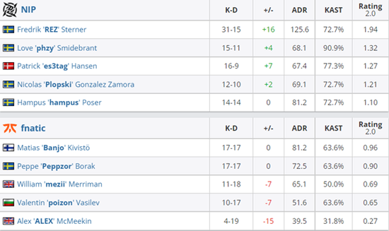 EPL S15第一日:第二场比赛Entropiq对阵MOUZ,Forester爆炸火力稳定连杀是取胜MOUZ 2-0的关键。第三场比赛NIP对阵fnatic,两名替补队友上场未能作用出奇妙反应,REZ状态火热,英雄AK或是连杀都是信手拈来,两张地图砍下1.90Rating与127ADR。