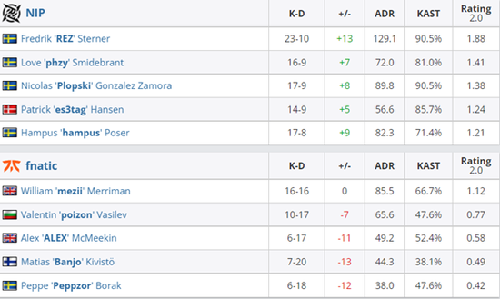 第八局fnatic摆出中路套餐取得人数优势后双人前压B区一换二,比分再次扳平。经济不好的NIP抱团斜坡夹A,沙鹰各个一发头翻盘成功。fnatic仍在中路摆套餐取得人数优势,NIP局部夹A打崩fnatic经济。第十二局fnatic清空斜坡迅速回防B区奠定胜局。面对单人干摸骚扰后路的fnatic无计可施,总能第一时间被换到人数,另一边NIP抱团进攻攻势极强招架不住,上半场比分9-6。下半场手枪局fnatic爆弹B区中路提B,中路REZ接住两人拿下手枪局。长枪局fnatic爆弹A区,NIP瞬间回防人数取胜。第二十局fnatic第一时间来抢斜坡,NIP有狙有步枪防守如铜墙铁壁,比分14-6。次局rush B失败送出赛点。经济不好的fnatic被NIP两场大比分带走。