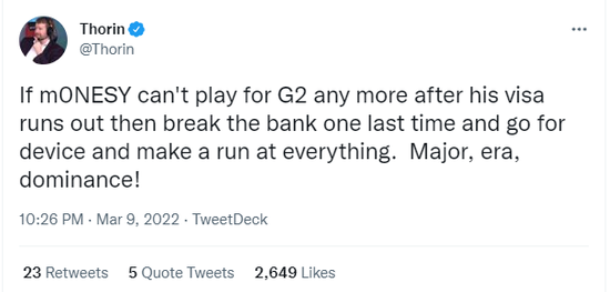 分析师Thorin在他的推特上发布个人观点,他认为在当前国际形势下,如果m0NESY因签证问题无法继续为G2效力,那么管理层应该把device作为考虑对象: