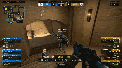 次局开局拿下人数优势的G2遭遇了MOUZ一波散作满天星的各点同步静默,Bymas从A2摸下绕道A1刺杀了太子爷m0NESY,捡起大狙再狙一人,配合队友瞬间融化了G2的防守。