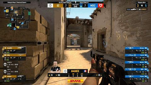 比分危急,状态不佳的NiKo直接搬来太子爷m0NESY一道前压外场收下两人,残局阶段dexter配合frozen险些完成2v5残局,好在关键时刻m0NESY稳住局面,G2开始扳分。比分来到6-7,NiKo在抓到外场红箱上timing的时候枪法变形,送出关键人头,2打2阶段Bymas凭借一手“贪玩单门”赢下了残局。最终局,凭借对前压时机的把握及对手timing,G2混起局翻盘战胜全枪全弹的MOUZ,半场比分来到8-7,MOUZ略胜一筹。