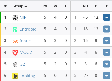 至此,EPL S15 A组的小组赛全部结束,最终NIP、Entropiq与fnatic晋级,小组积分如下: