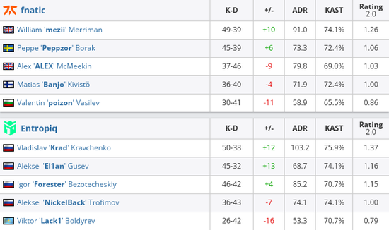 图二是Entropiq选择的Vertigo,fnatic先选择防守,来到自己的强图Entropiq更加自信,进入到长枪局后再次接管比赛,半场取得10-5的领先,El1an依旧是Entropiq发挥最稳定的点,而Krad和Forester也依旧状态火热,面对如此状态的Entropiq,fnatic在poizon大狙失灵的情况下只能败下阵来。