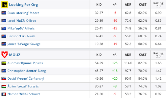 另外一边的对局是LFO对阵MOUZ,图一是澳洲人选择的Dust2,面对自己的澳洲兄弟dexter直接读穿对手带领MOUZ一路拿分。上半场LFO作为进攻方仅仅拿到可怜的三分,随着下半场丢掉手枪局,LFO大势已去最终6-16输掉图一。