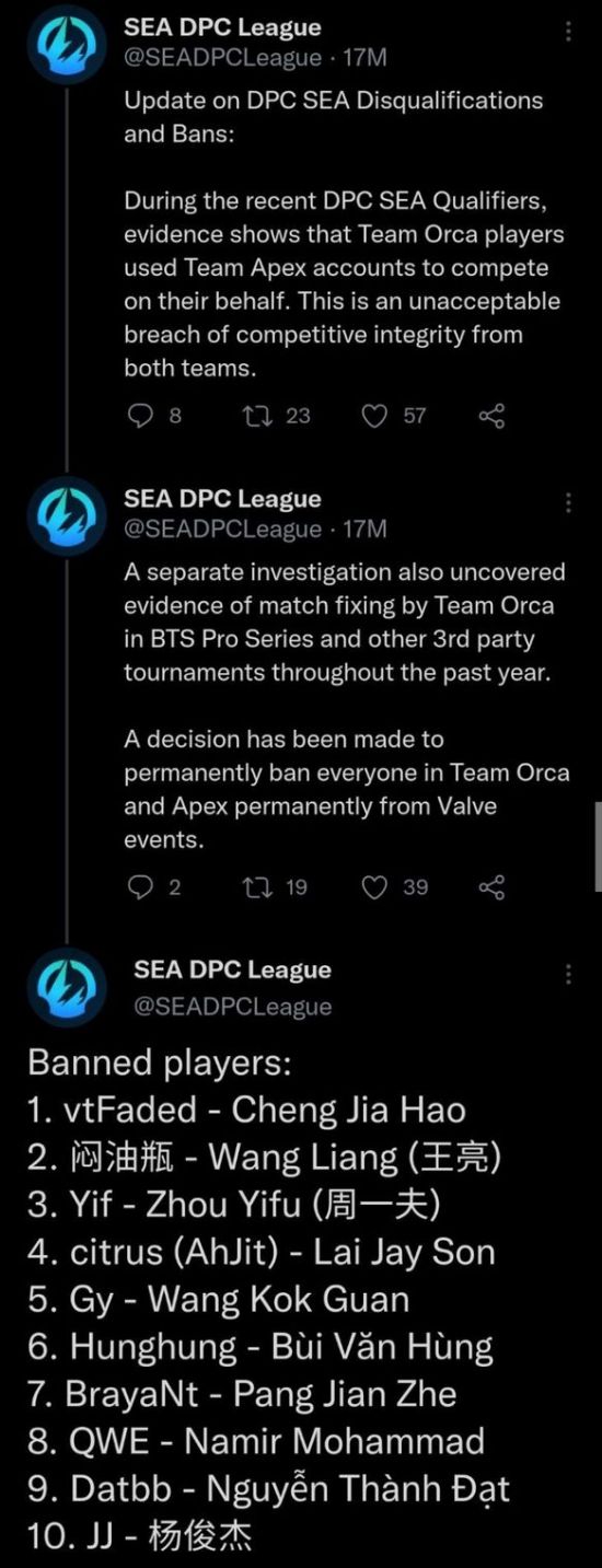 在最近的 DPC SEA 预选赛中,有证据表明 Orca 战队的选手使用了Apex战队的选手账号并代表他们参加比赛。 这两支战队的不可接受行为违反了竞争诚信。