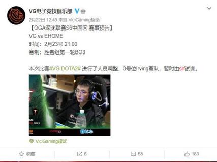 Erika采访中经典“保4争6”本赛季,他们各项赛事的成绩都刚好处在及格线上,DPC联赛第五保级、IWO止步六强。该赢的队伍都能拿下,面对纸面实力比自己强的对手也输得干脆。在深渊联赛前,VG突然官宣了Irving的离队,替代者是大家的“老熟人”srf。深渊联赛他们先后输给EHOME和RNG后也早早出局。