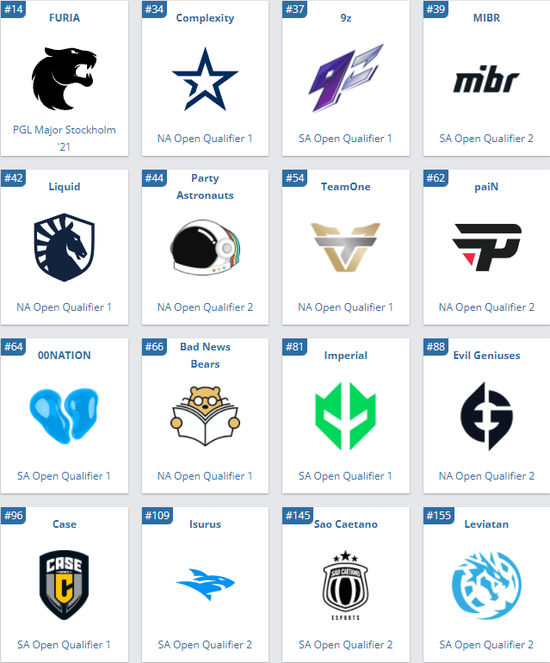 随着Valve对RMR赛事的修改,北美与南美赛区并入一道,16支晋级队伍通过瑞士轮决定最终晋级的6支队伍,其中1支传奇组队伍,2支挑战者队伍,3支竞争者队伍。