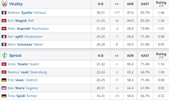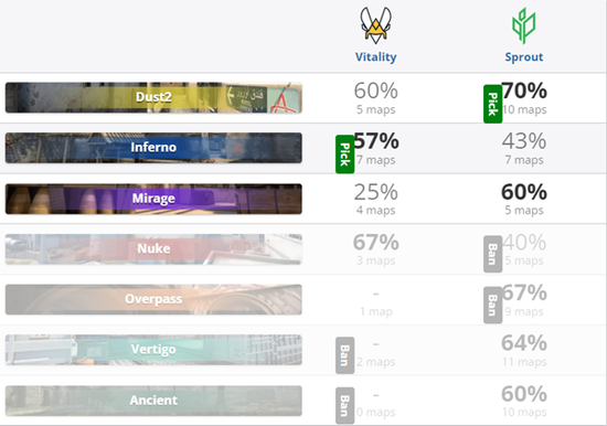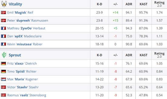 Vitality 2-0 Sprout(Dust2 16-7;Inferno 22-20)