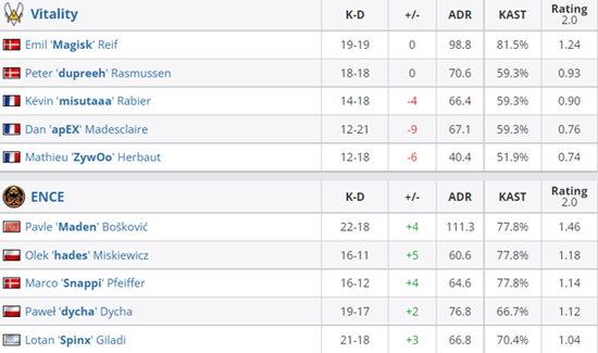 ENCE慢慢找到状态,多点抓timing反刷建立人数优势追平比分。第十五局小蜜蜂反清A大,dycha早已踩到大坑挽回劣势,Snappi警家架狙双杀,A大dupreeh1v2定格上半场比分8-7。下半场手枪局ENCE封住XBOX,中路Magisk一换二,A小ZywOo再秒两人赢下手枪局。次局强起的ENCE爆弹B区,,道具覆盖完美攻破包点翻盘成功。小蜜蜂不甘示弱也选择强起,ENCE抱团过A大利用道具轻取包点反超比分。长枪局ENCE B点爆弹骚扰,A小重拳出击顶级战术再拿一分。第二十二局ENCE道具逼退A小后爆弹B区二换二攻破包点,ZywOo火烧狙击位解决关键人头回防成功。次局ENCE抢下A大秒杀misutaaa,ZywOo利用烟雾弹在忍者位拖够时间,A小回防的丹麦双人组枪法够硬赢下劣势残局,比分11-12。hades中门狙杀ZywOo,ENCE静摸A小配合A大dycha攻破包点。ENCE灵性指挥静摸中门抓timing首杀后Spinx踩火秒杀B区单人拿到赛点。第二十七局ENCE抱团反清A大,Magisk状态不佳一人未换,ENCE封住警家烟埋下雷包 2-0击败Vitality。