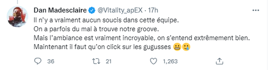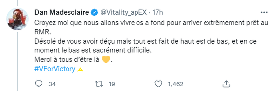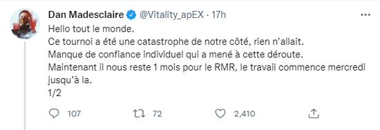 Vitality在本次EPL S15仅仅取得一胜四负的战绩,未能小组出线。面对队伍目前的状况,队长apEX于昨日在推特上用法语作了一番陈述。
