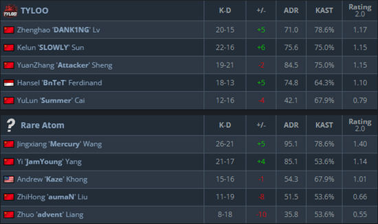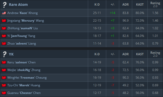 败者组次轮:Rare Atom 2-0 YK(Nuke 16-3;Mirage 16-9)
