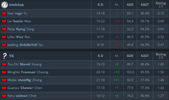 败者组首轮:Invictus 0-2 YK(Inferno 10-16;Nuke 6-16)