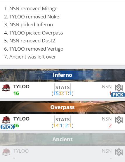 TYLOO 2-0 NSN(Inferno 16-1;Overpass 16-2)