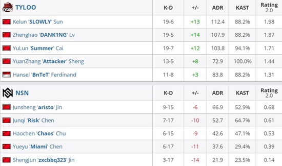 ESL挑战者联赛S40亚洲的比赛已经正式打响,TYLOO首战告捷,2-0击败NSN。本场比赛SLOWLY的手感火热,两图砍下46-15 KD与2.08 rating的恐怖数据,带领队伍分别在Inferno和Overpass上以16-1与16-2轻松赢下比赛。