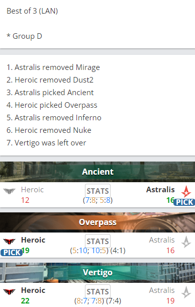 Heroic 2-1 Astralis (Ancient 12-16;Overpass 19-16;Vertigo 22-19)