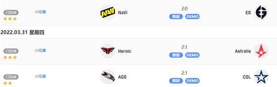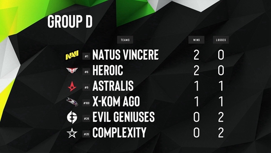 EPL S15小组赛D组:AGO让一追二击败Complexity完成首胜。第二场丹麦内战Heroic对阵Astralis,sjuush的多次关键发挥将比赛拖入加时,Heroic让一追二完成逆转。第三场NaVi对阵EG,NaVi手起刀落2-0轻松战胜EG。