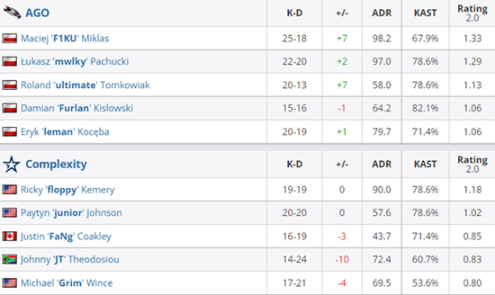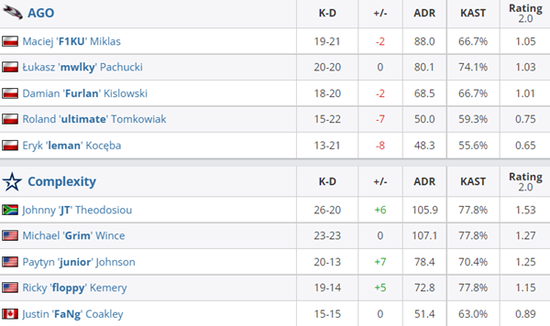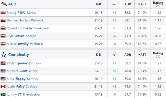 第九局半起的AGO抱团打A小,F1ku run boost干拉平推大狙翻盘成功。 Complexity防守渐入佳境,JT与Grim步枪活力加持junior大狙,AGO上半场仅拿到三分。下半场手枪局Complexity抱团出A大,AGO回防枪法更硬赢下手枪局。强起的Complexity中路转A小,junior鸟狙发挥三杀翻盘成功。Complexity顺利拿到赛点。赛点发力的AGO为时过晚失去图一。