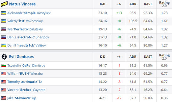 强起的EG夹A,Brehze突破攻破防线,A小的autimatic也有收获翻盘成功。NaVi强起败给了枪械劣势,NaVi不断强起,EG连续得分。 CeRq关键三杀破除B区防线,EG ON FIRE。第二十三局出现转机,b1t单人防守三杀阻止进攻。s1mple大狙不断夺首杀,EG最终得分卡在10分,NaVi连拿四分结束比赛。