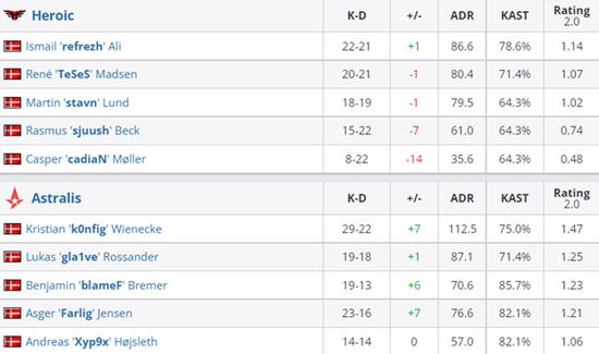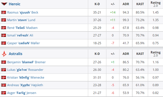 下半场手枪局Astralis A大出击不敌Heroic后佯攻B区后转A,blameF背身未击杀拆包CT,Heroic开始追分。长枪局Astralis夹A,blameF三杀证明自己。强起失败的Heroic被Astralis连续拿分。k0nfig干摸A区三杀帮助Astralis拿到赛点。而Astralis却犯了赛点综合征,sjuush的1v3更是振奋队伍气氛,最终Heroic追平比分进入加时4-1击败Astralis。
