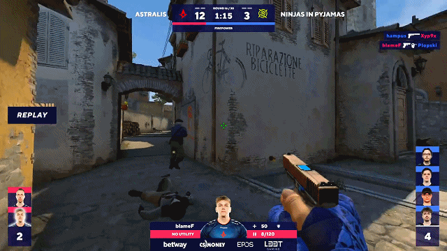 blameF同样是在香蕉道附近,在BLAST全球总决赛2021中献祭队友,之后他宛如上了一个强力BUFF,用格洛克一人单挑NIP打出六杀!