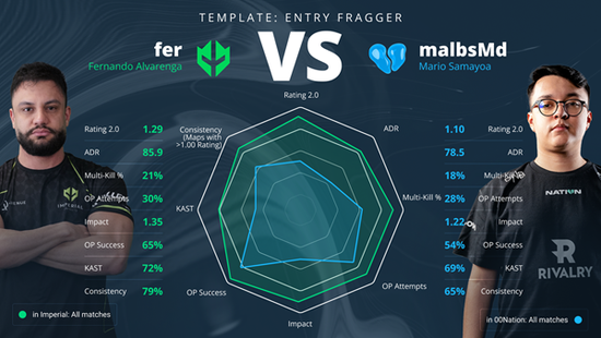 fer 已经成为 Imperial 目前队内的明星选手,他是队内迄今为止 rating 最高的成员,VINI 的 1.19 rating 比之 fer 的 1.29 相形见绌,fer 在提高个人 rating 的同时也是队内最具侵略性的选手。他在参加的所有三场赛事中突破能力都处于领先地位,在 RMR 预选赛中获得了 1.20 的突破 rating,在 BLAST Showdown 预选赛中获得了 1.55 的突破 rating,在 OMEN 赛事中获得了 1.27 的突破 rating。VINI在平均 rating 方面排名第二,他在突破统计数据方面也仅次于 fer 。换言之,fer 和 VINI 是 Imperial 的关键人物,他们是队内最具侵略性和最强的得分手。一切似乎都正沿着这位传奇 IGL——FalleN预设的道路进行着,尽管外界可能会说 fer 的发挥并不会长久稳定。