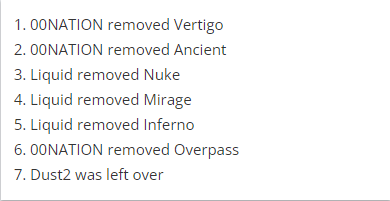 EliGE:我认为没有这方面的心理影响,我们是像对待其他比赛一样进行准备的。一开始我们对00Nation做了功课,但之后出了问题。我们选择当“Team B”,这样我们就可以选边(相应的,作为Team A的00Nation可以在BP的最后确定打哪张图)。我们准备了Overpass和Ancient,而打得却是Dust2。