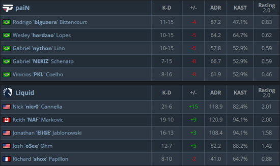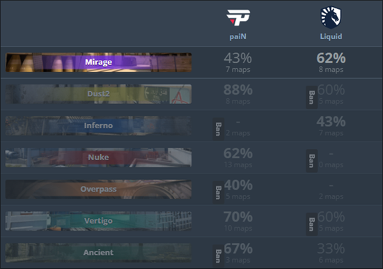 PGL RMR美洲区,本场对战由Liquid对阵paiN,似乎今天paiN的回防战术并不能针对同样选择慢速打法控图做默认的Liquid,在多个残局也是因为枪法失误被处于人数劣势的Liquid队员扳回局势,最终气势全无的paiN没能创造奇迹,被Liquid以16-1的比分击倒在Mirage。