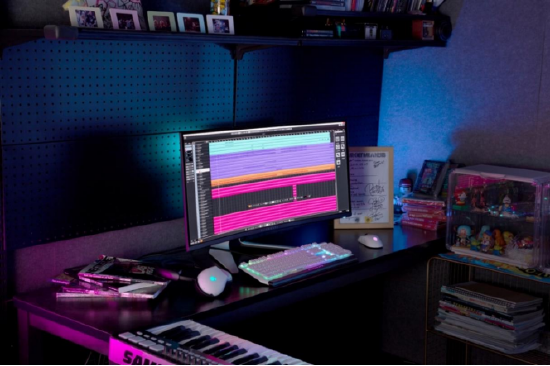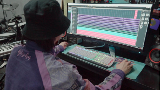 在编辑处理音效时,超级斩则用的是AW3423DW 创新量子点QD-OLED 34英寸曲面显示器。显示器采用量子点自发光面板,呈现更加细腻逼真的图像。34英寸超大曲面屏,可以更完整显示音频轨道,一眼就能看到整体音频波形,让超级斩的音乐创作更舒适高效。