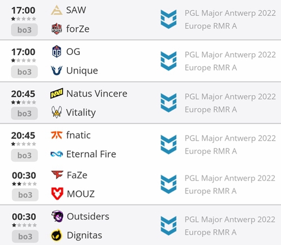 昨天四场BO1,仅有Vitality没有“爆冷”输给排名比自己低的队伍。SAW战胜了fnatic,MOUZ击败了Virtus.pro,forZe击败了OG。除了欧洲赛区各队伍之间的实力差距十分接近外,BO1也是原因之一。无论如何,6支1-2的队伍今天还要有3支告别Major,来到BO3的对决,比拼的就是队伍的硬实力了。OG会连续两次冲击Major失败吗?上届打入Major淘汰赛的Virtus.pro会无缘Major吗?f0rest还有机会闯进Major舞台吗?且看今晚揭晓。