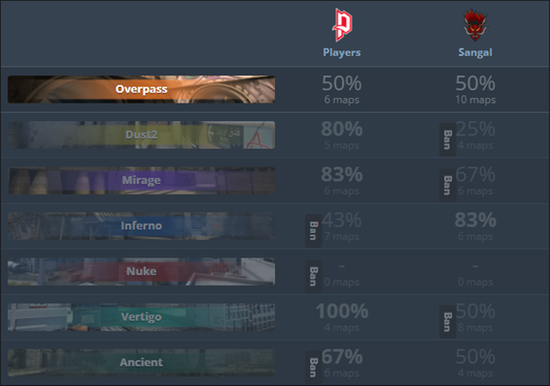 乘胜追击的Sangal重防长管先取首杀加上S3NSEY大狙的偷人得分,双狙的防守让Sangal能各处偷人先一步磨灭Gambit的攻势锁定胜局,但意识到对方的多狙防守后Gambit抱团补枪攻进A区稳稳赢下上半场最后一回合锁定3-11比分。长管提速让Sangal先拿手枪局再顺势轻松拿下下半场前三分将比分拉至6-12。