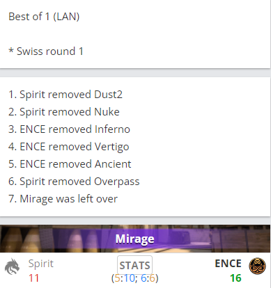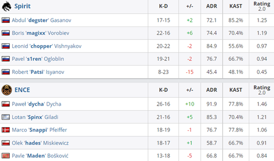 同时dycha不讲道理的枪法更为NCE加上坚固的防线。反观Spirit,不断丢失首杀,控图提速一波也不能突破ENCE防线,ENCE一鼓作气上半场拿到10分。下半场手枪局ENCE rush B,dycha攻占下超市阻断回防,次局Spirit强起失利,ENCE扩大比分差距。来到长枪局ENCE控图后干拉B区,dycha率先击杀包点大狙,Spirit回防极快挽回劣势,magixx丝血1v2残局拯救队伍,同时点燃了队内气氛。绿龙找回状态顶住第一枪位,比分差距逐渐缩小。调整过后的ENCE抱团干拉B区打崩CT经济。次局再来抱团rush B,强起的绿龙三人重防B区翻盘成功。关键时刻dycha扛起大旗再次突破B区帮助ENCE拿到赛点。赛点经济崩塌的CT防不住土匪的一波攻势,ENCE取得首胜。
