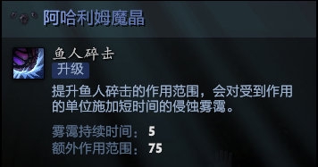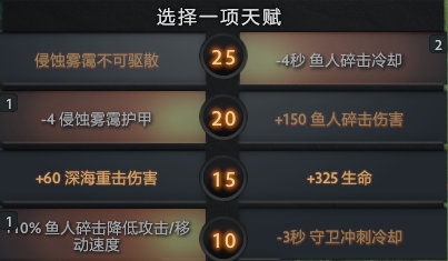 在天赋方面10级选择-3秒守卫冲刺冷却,15级根据情况选择+60深海重击伤害还是+325生命,20级选择我们的关键天赋+150鱼人碎击伤害,25级选择侵蚀雾霭不可驱散。