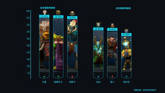 本周陈在胜率上完成了飙升,直接上升了6%,这主要归功于陈的线上能力以及“鹰身女妖侦查者”在中后期的视野控制能力。