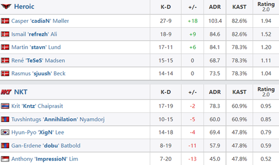 下半场手枪局外场stavn大开杀戒,三杀阻拦NKT下K1的意图,Heroic轻取手枪局。长枪局Heroic似乎洞察了NKT的进攻方向,外场前压瓦解NKT默认,比分反超。尽管NKT寻求变速,但cadiaN的大狙却不给机会,极高的命中率让土匪的进攻欲望消失殆尽。Heroic防守连得10分拿到赛点。扳回一个赛点的NKT为时过晚,在下半场仅仅拿到1分后被Heroic碾压。