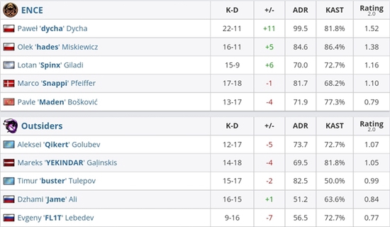 顶住压力的buster带领VP.Outsiders成功回防A区取胜手枪局,但起出冲锋枪的ENCE立即提速上B成功翻盘。ENCE连续的提速让VP.Outsiders无所适从,被ENCE在长枪局转点击溃后再没能起势,最终无奈倒在Vertigo。