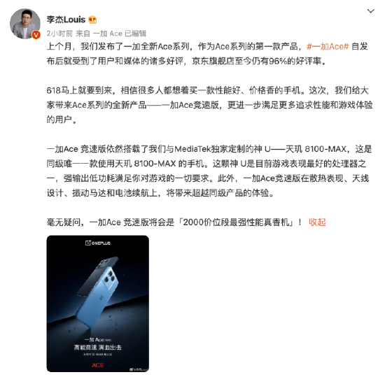配置方面,全新的一加Ace 竞速版将搭载一加与MTK独家定制的神U 天玑 8100-MAX,拥有着性能强、功耗低的特性,轻松应对目前市面上的主流手游,称得上是当前游戏体验最好的处理器之一。另外,一加Ace 竞速版也将在整机散热、天线设计、马达与电池续航上发力,打磨出优于同级产品的出色体验。对此,一加中国区总裁李杰表示一加Ace 竞速版将会是“2000价位段最强性能真香机”。