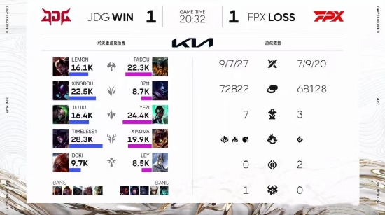 开局即焦点,决战伊始双方即展开激烈的攻防战。前期FPX的推塔战术被JDG成功防御。战术灵活的FPX再度调整策略,打出0换5的亮眼表现,带领单人路兵线推掉JDG水晶,暂时领先。总决赛第二局,前期FPX多人中路越塔,以闪电快攻寻找节奏。JDG选择稳扎稳打,将优势牢牢引向己方。中期龙坑遭遇战成为关键点,JDG拿下云端亚龙,进一步将优势扩大。越战越勇的JDG在拿下大龙BUFF后,全员中路直推,将比分扳为1:1平。